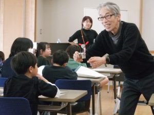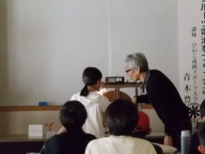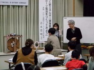 まず、講師のびわこ成蹊スポーツびわこ成蹊スポーツ大学名誉教授青木豊明先生から、電気の仕組みや水力、風力、温度差、振動など自然エネルギーの仕組みをキットを使って学びました。