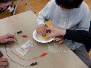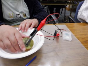 そして、いろんなフルーツなどを使った発電実験。甘夏、バナナ、レモン、いちご、トマト、こんにゃく、豆腐のなかでどれが一番発電するかを予想しました。